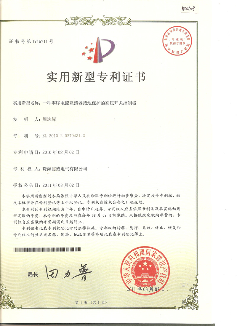 (實用新型)一種零序電流互感器接地保護的高壓開關(guān)控制器