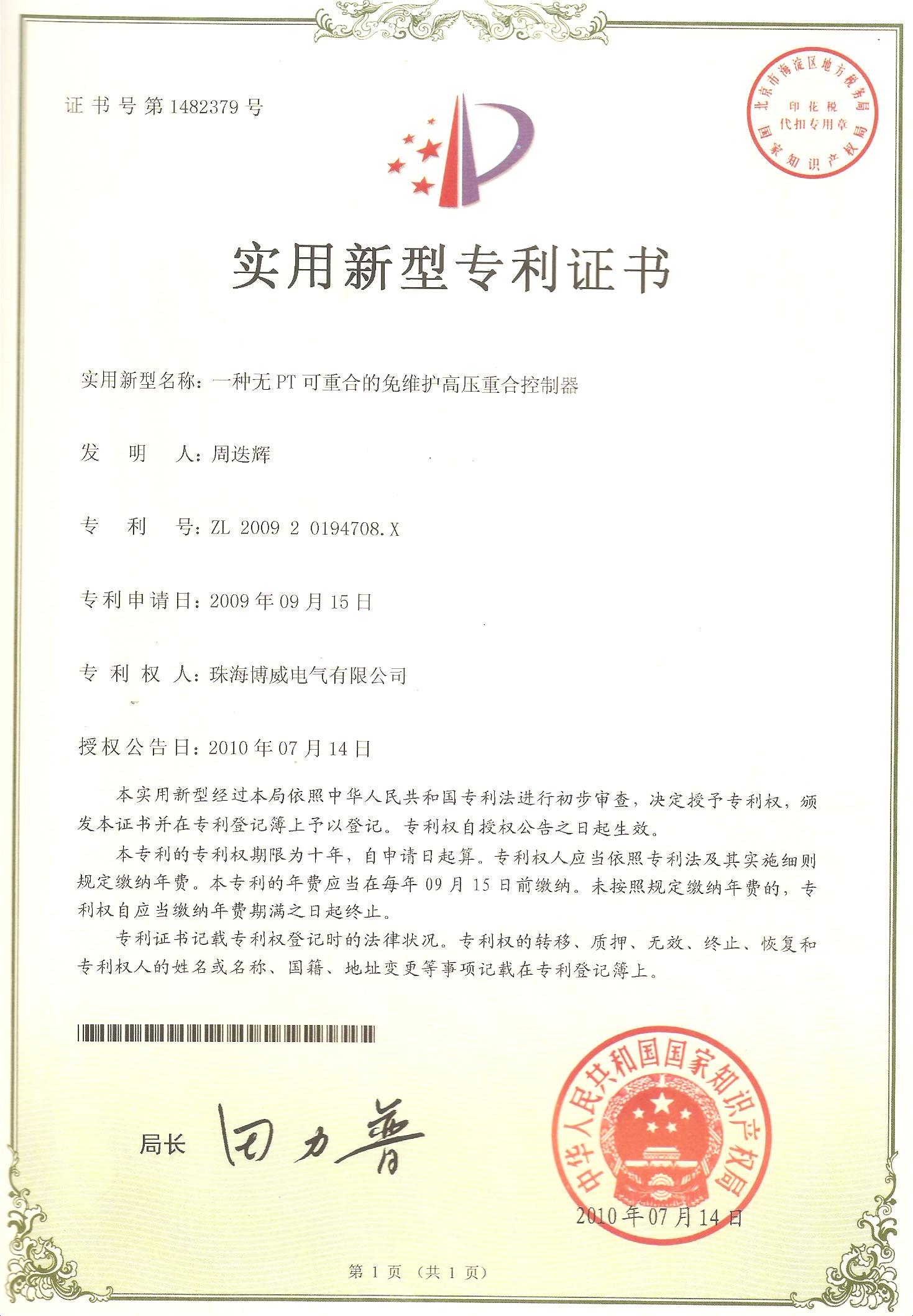 (實用新型)一種無PT可重合的免維護高壓重合控制器
